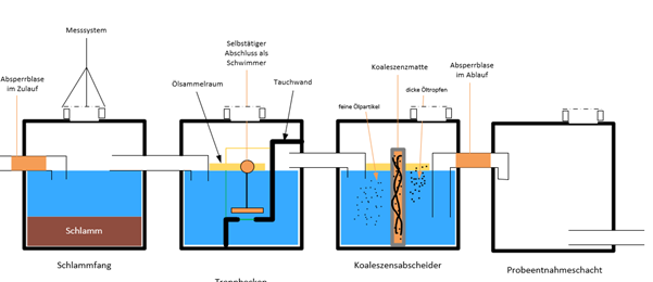Leichtflüssigkeitsabscheider für Öl oder Benzin funktionieren nach dem Schwerkraftprinzip. Im ersten Schritt sinken schwere Stoffe wie Schlamm in einem separaten Tank auf den Grund. Leichtere Stoffe mit einer geringeren Dichte wie z. B. Wasser oder Öl gelangen an die Oberfläche. Danach gehen die Flüssigkeiten in das eigentliche Trennbecken über. Das Öl oder Benzin ist in Form von Tropfen im Wasser verteilt und wird durch die Koaleszenz gebündelt. Koaleszenz beschreibt in diesem Kontext das Zusammenschließen bzw. Verschmelzen von Ölpartikeln. Praktisch wird dies mit Koaleszenzmatten aus einer Polyurethan-Dispersion erreicht. Dadurch steigen dickere Öltropfen an die Wasseroberfläche und können entnommen werden.